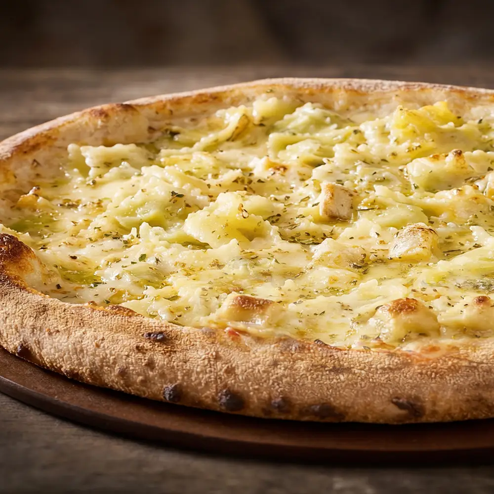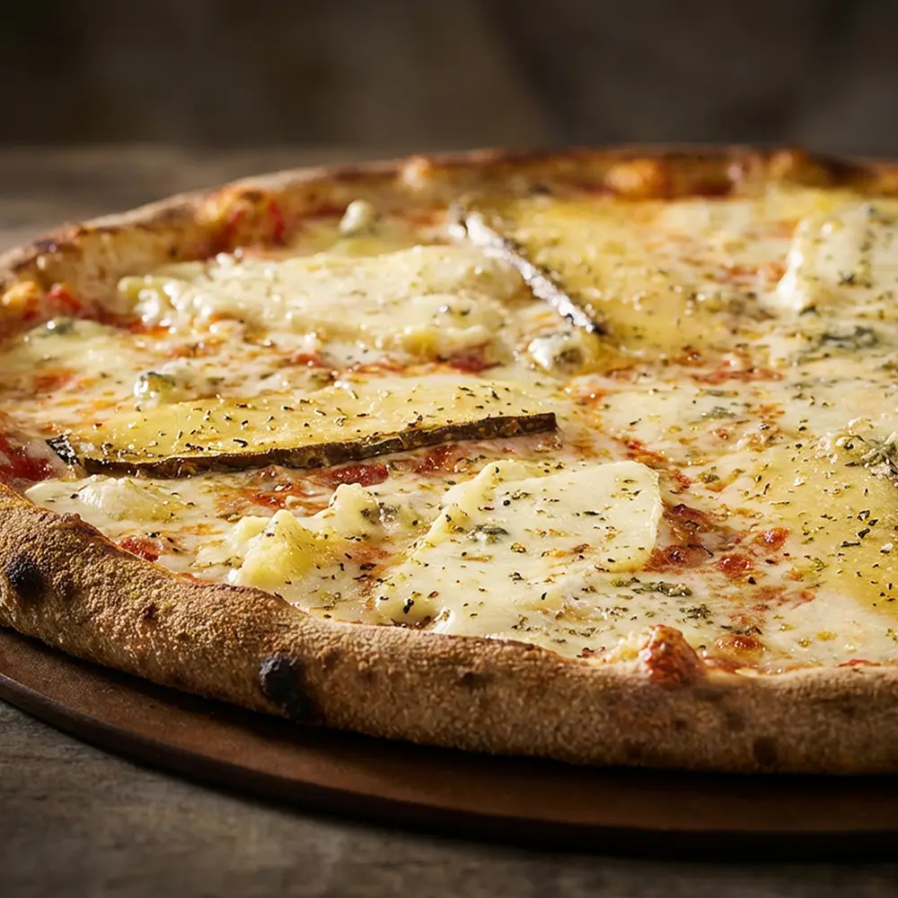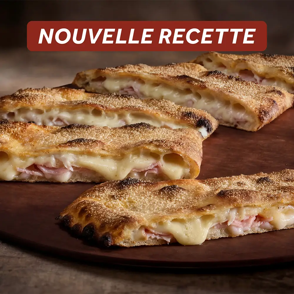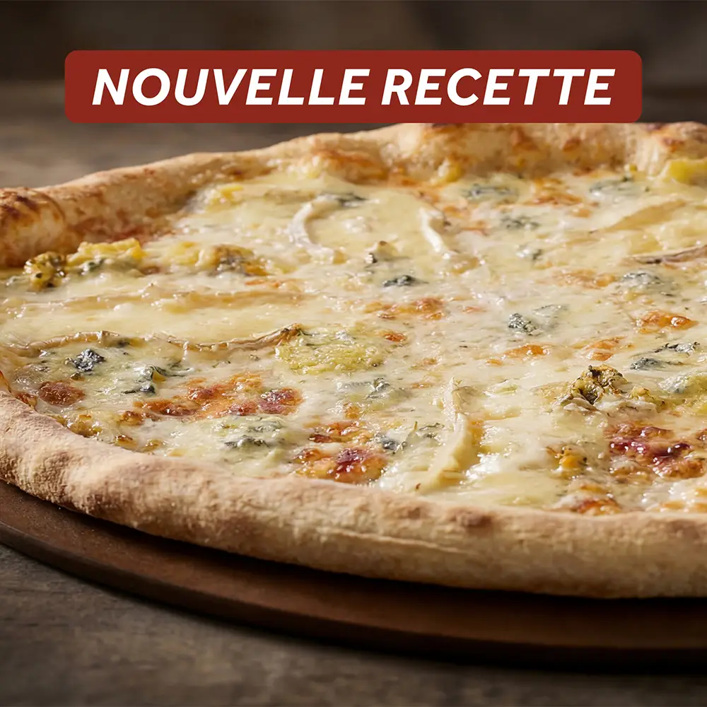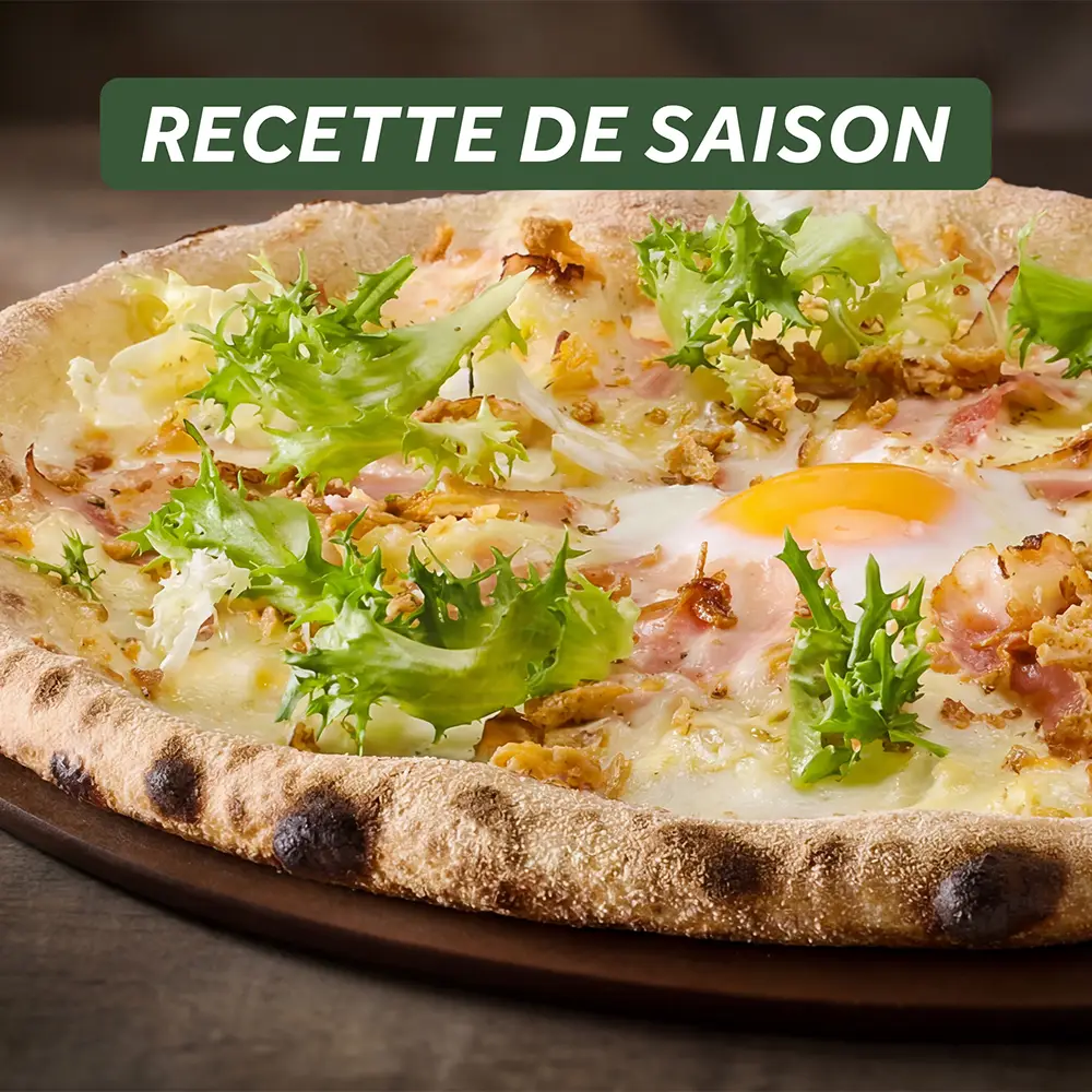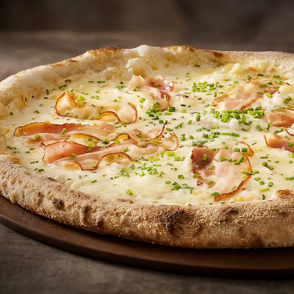 Crème, mozzarella fior di latte, poitrine paysanne fumée au bois de hêtre, Saint-Marcellin IGP et ciboulette fraîche.