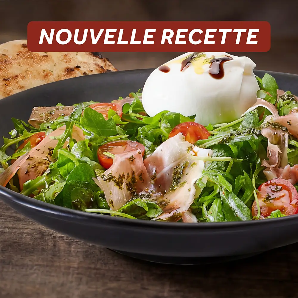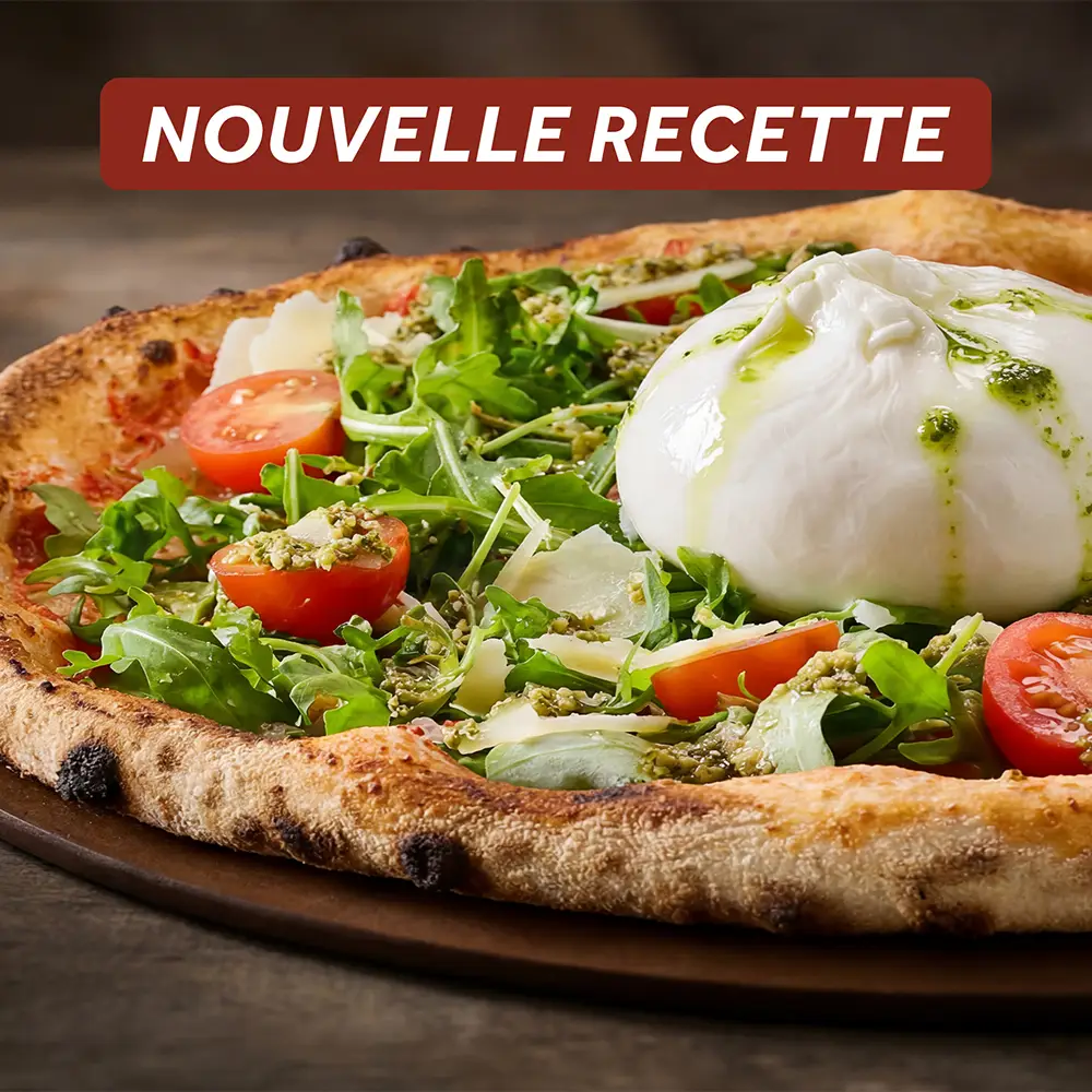 Sauce tomate, après cuisson : burrata di Andria IGP, tomates cerises, Parmigiano Reggiano AOP, roquette et pesto au basilic.