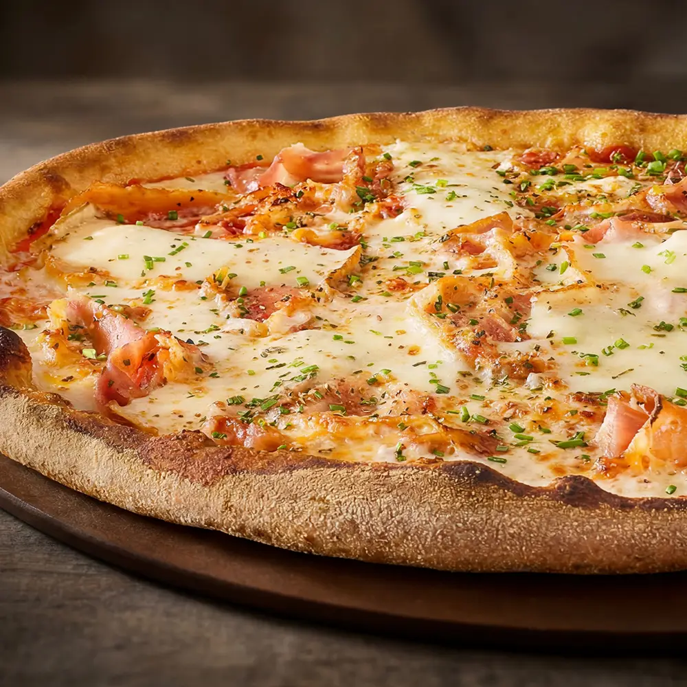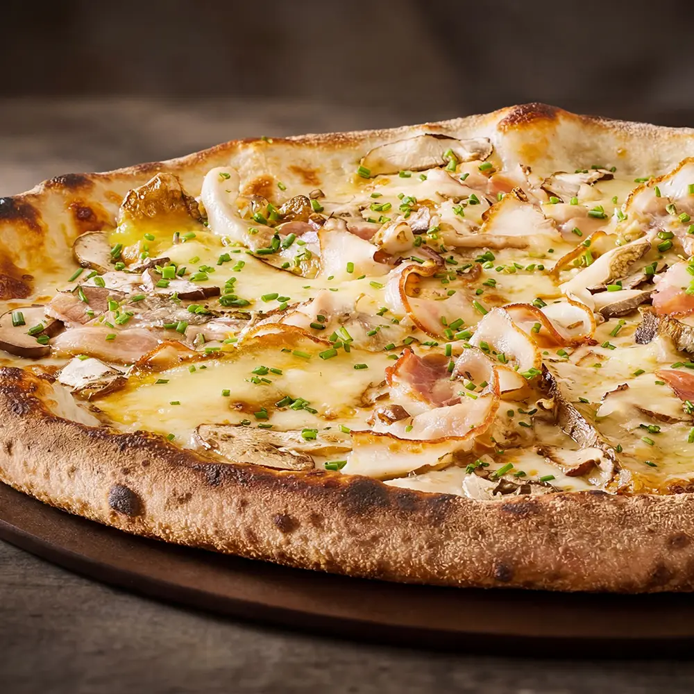 Crème, mozzarella fior di latte, champignons bruns de Paris, poitrine paysanne fumée au bois de hêtre, Tome des Bauges AOP et ciboulette fraîche.
