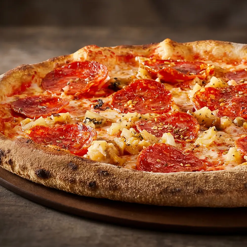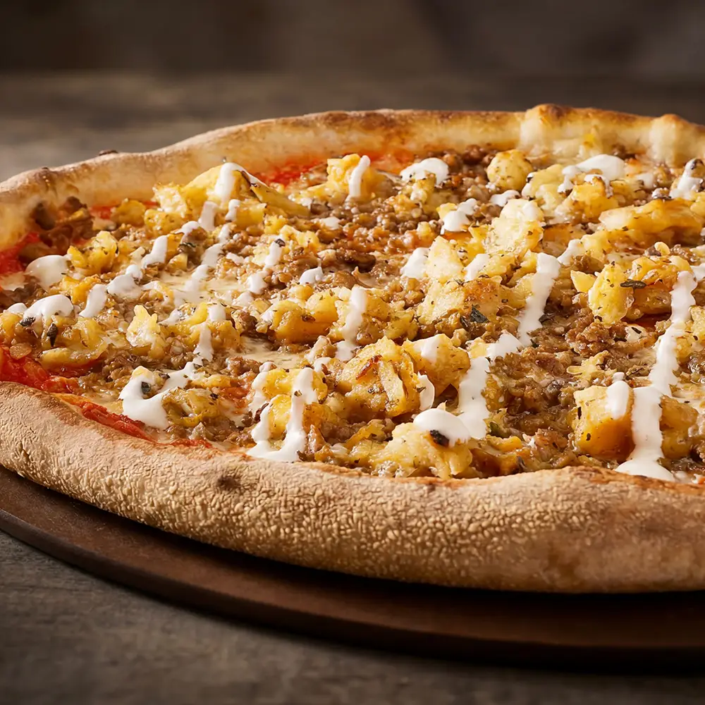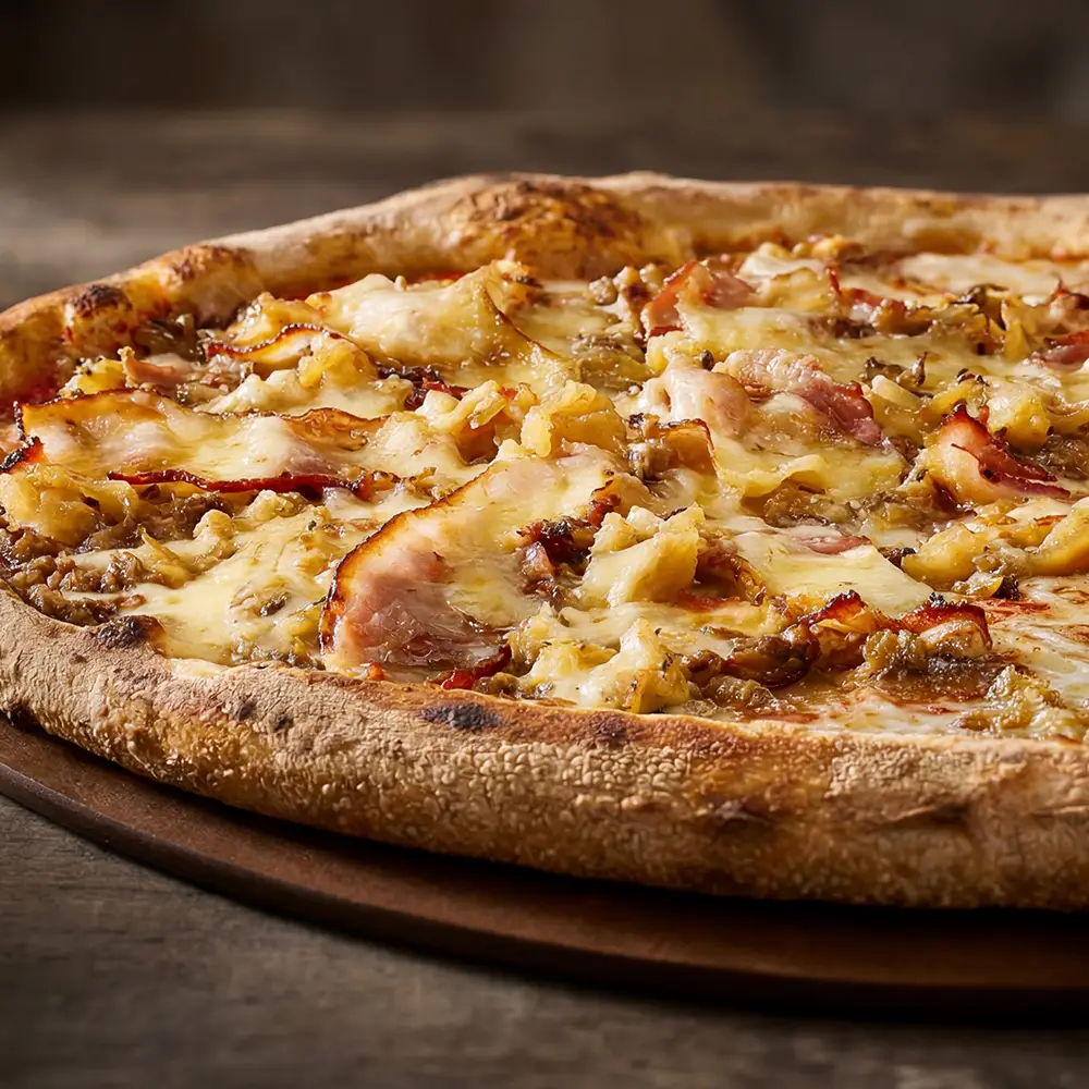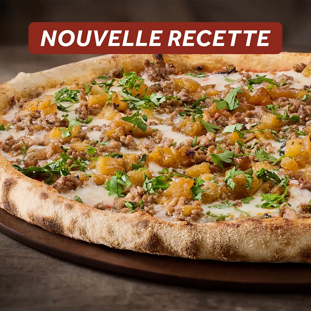 Sauce tomate, mozzarella fior di latte, bœuf haché, poitrine paysanne fumée au bois de hêtre, fondue d’oignons et cheddar AOP.