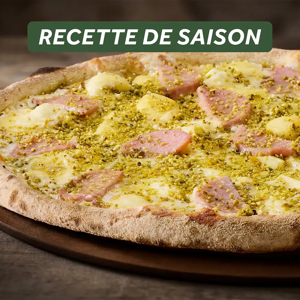 Crème, mozzarella fior di latte, saucisson lyonnais, pommes de terre, Saint-Marcellin IGP et poudre de pistache.