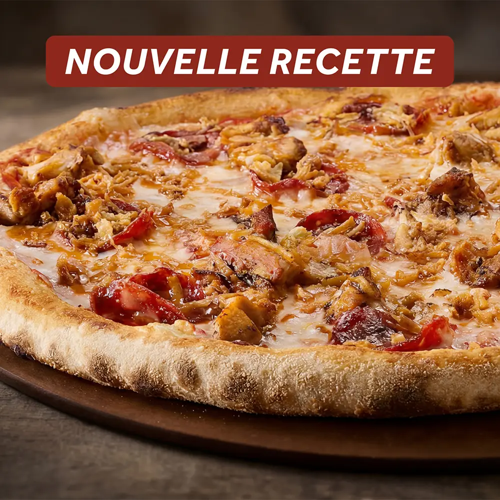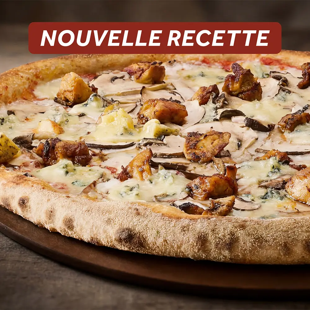Sauce tomate, mozzarella fior di latte, champignons bruns de Paris, poulet rôti maison et Bleu du Vercors-Sassenage AOP.