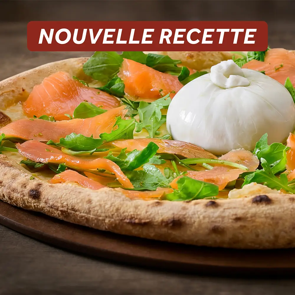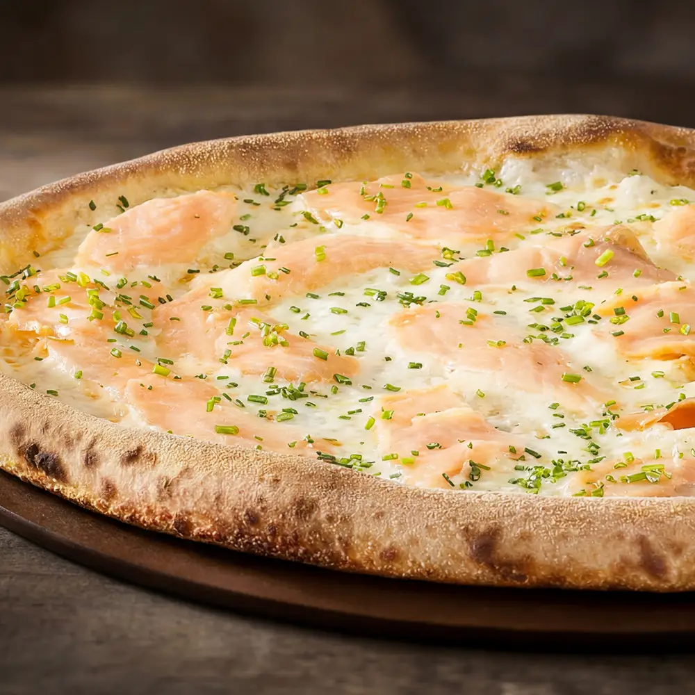 Crème, mozzarella fior di latte, saumon fumé au bois de hêtre et ciboulette fraîche.