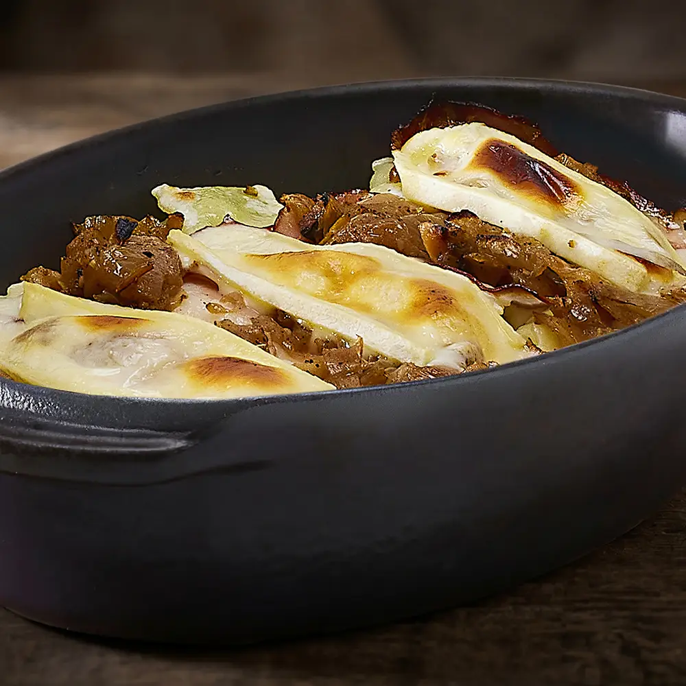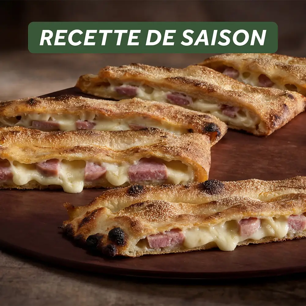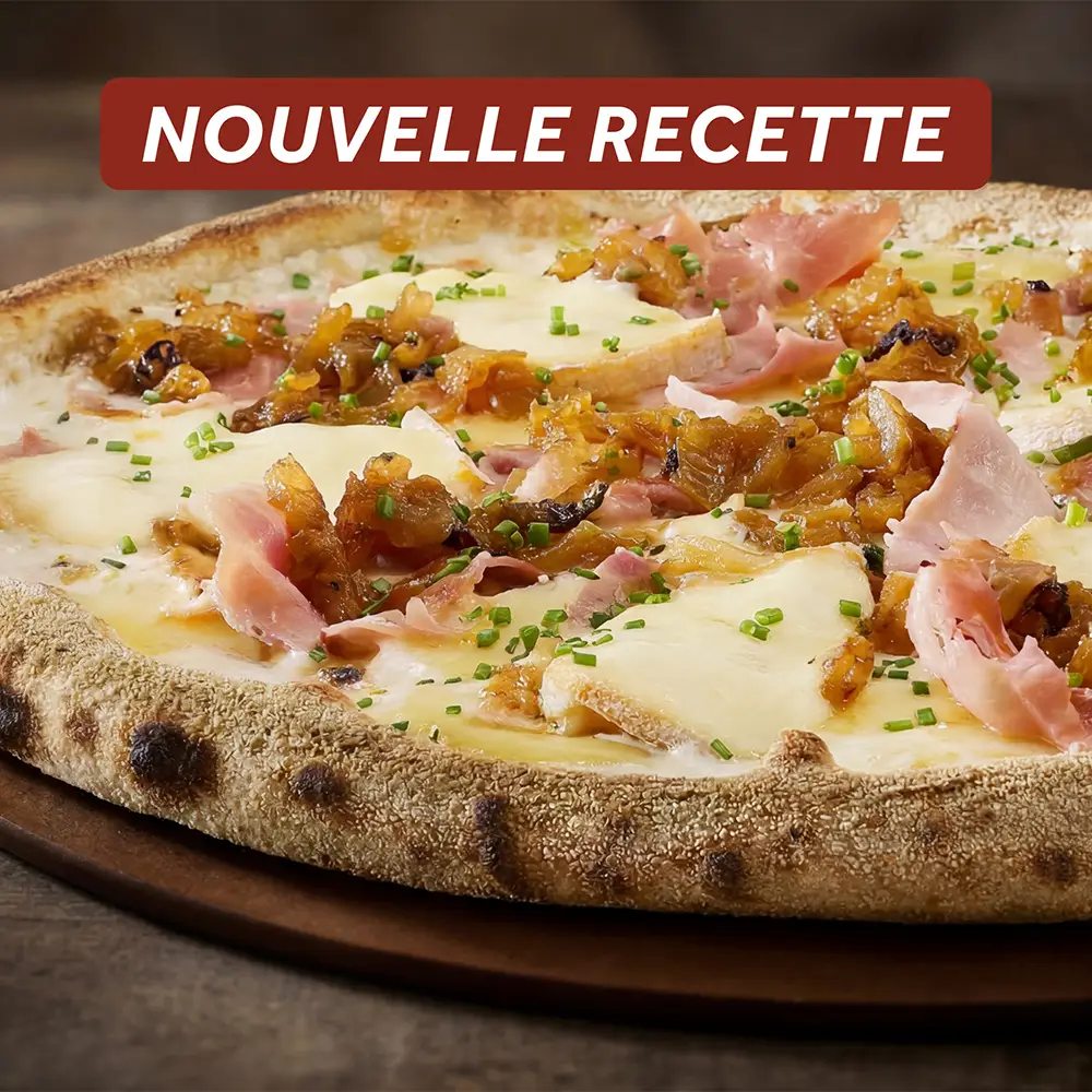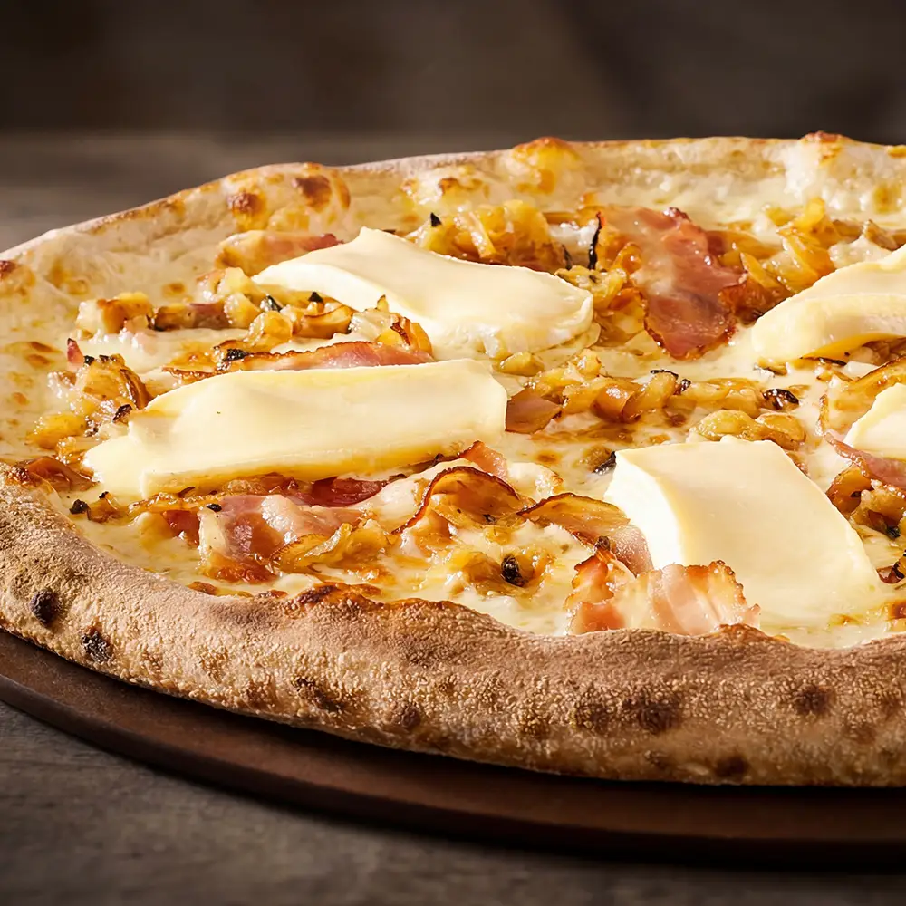 Crème, mozzarella fior di latte, Reblochon de Savoie AOP, poitrine paysanne fumée au bois de hêtre et fondue d’oignons.