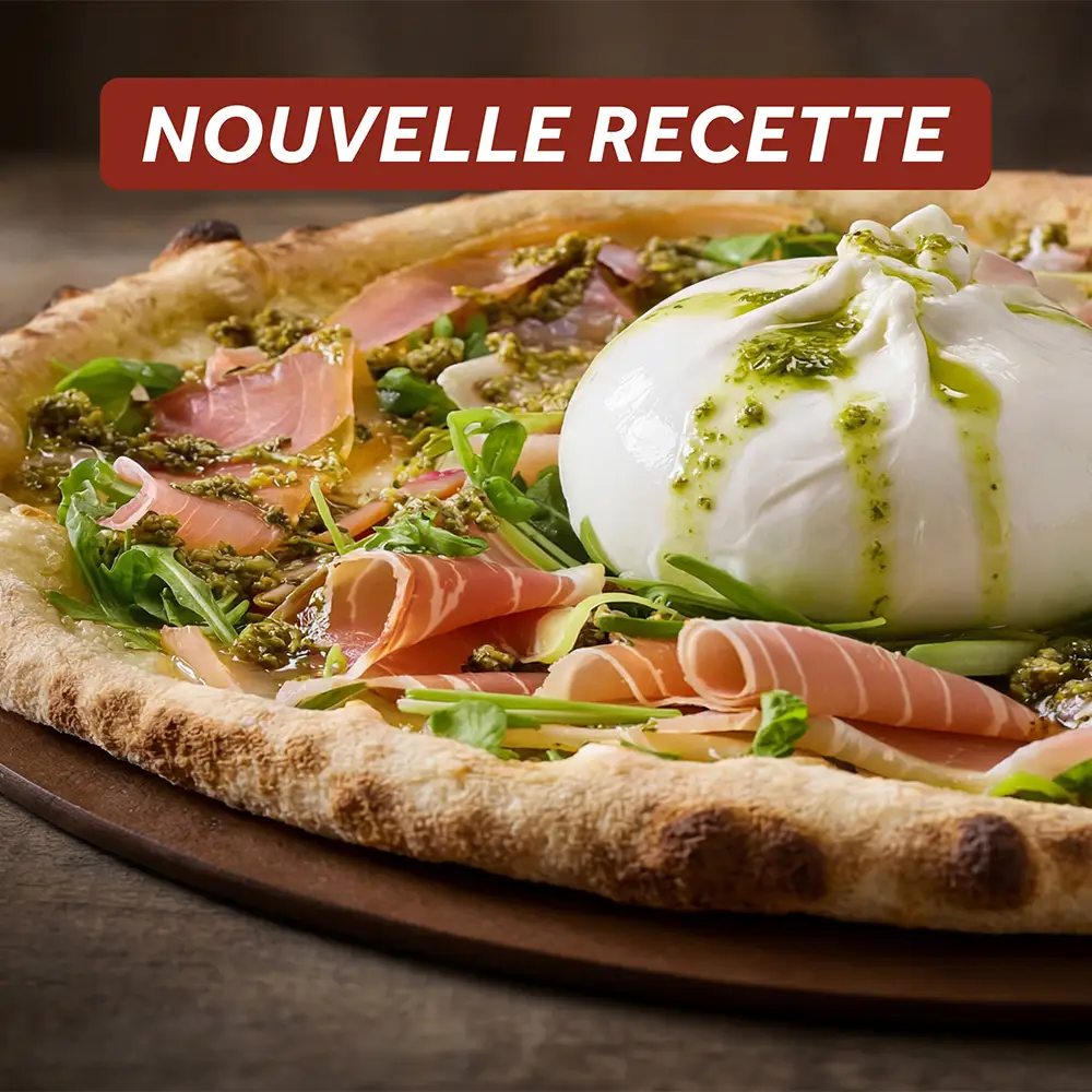 Mozzarella fior di latte, après cuisson : burrata di Andria IGP, jambon sec d’Ardèche IGP, roquette et pesto au basilic.