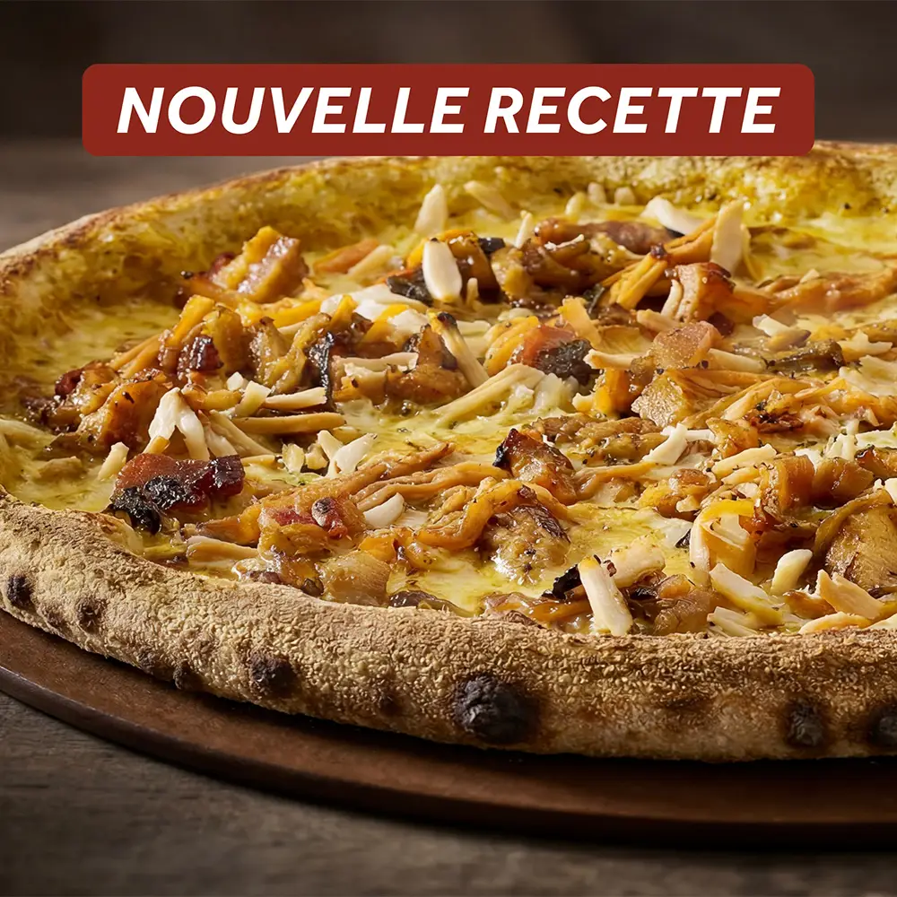 Crème, curry de Madras, mozzarella fior di latte, poulet rôti maison, fondue d’oignons, chutney de mangue et amandes torréfiées.