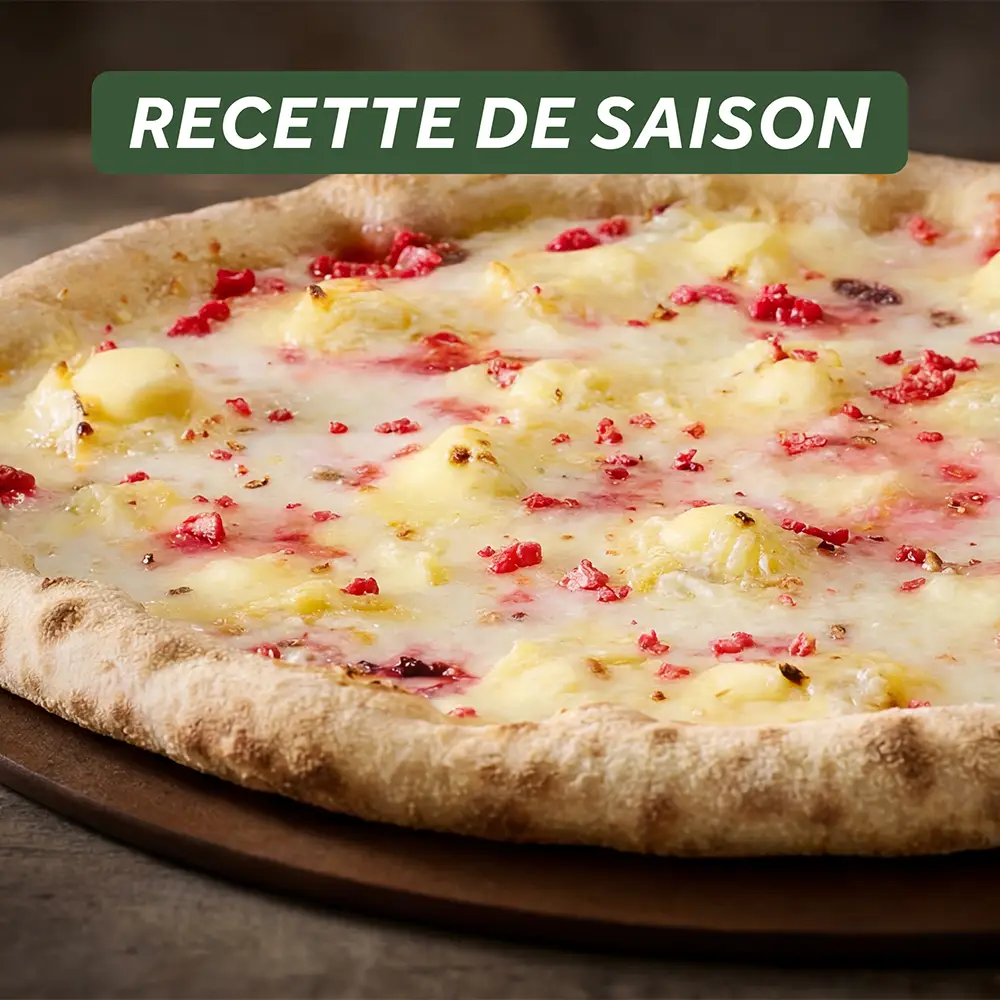 Crème, mozzarella fior di latte, Raclette de Savoie IGP, pommes de terre et jambon blanc, fondue d’oignons et ciboulette fraiche.