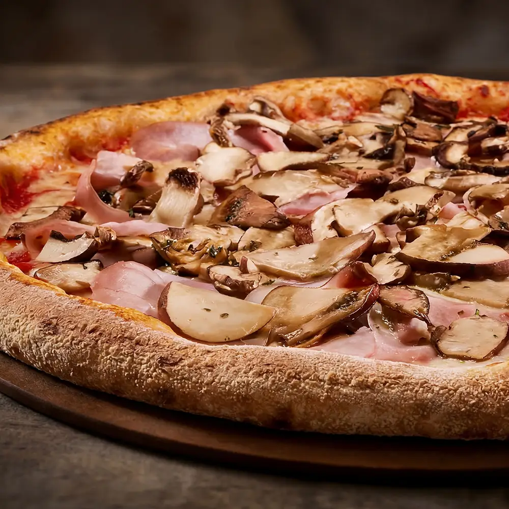 Sauce tomate, mozzarella fior di latte, jambon blanc et champignons bruns de Paris et origan.