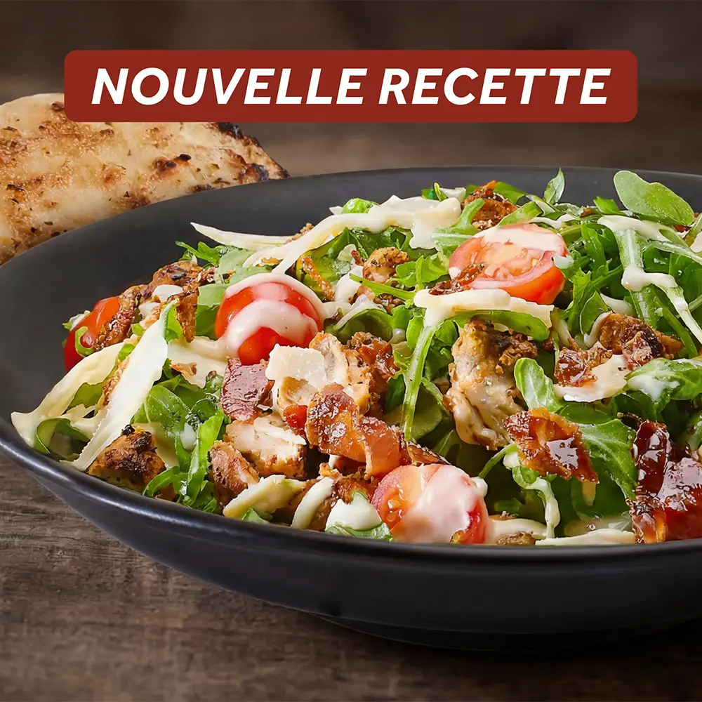 Poitrine paysanne fumée au bois de hêtre grillée, poulet rôti maison, Parmigiano Reggiano AOP, tomates cerises, sauce César.