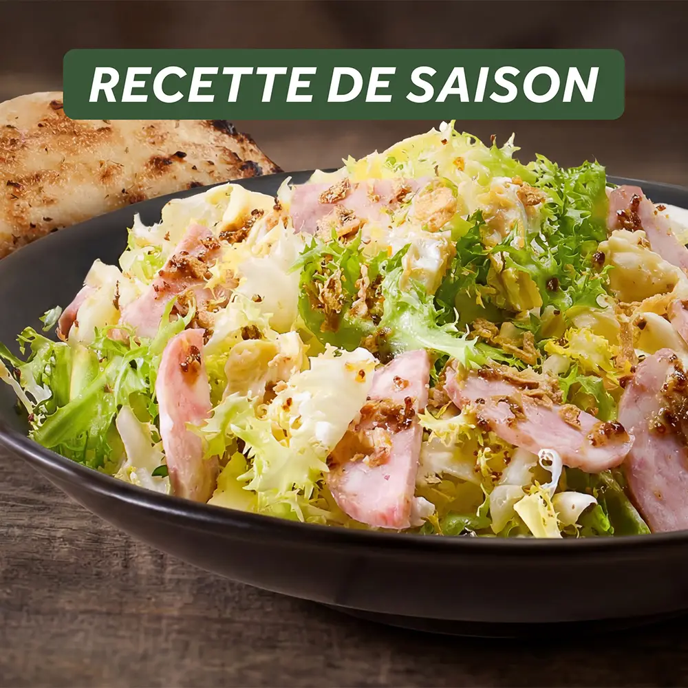 Salade frisée, saucisson lyonnais, Saint-Félicien, oignons frits, moutarde à l’ancienne au miel français.