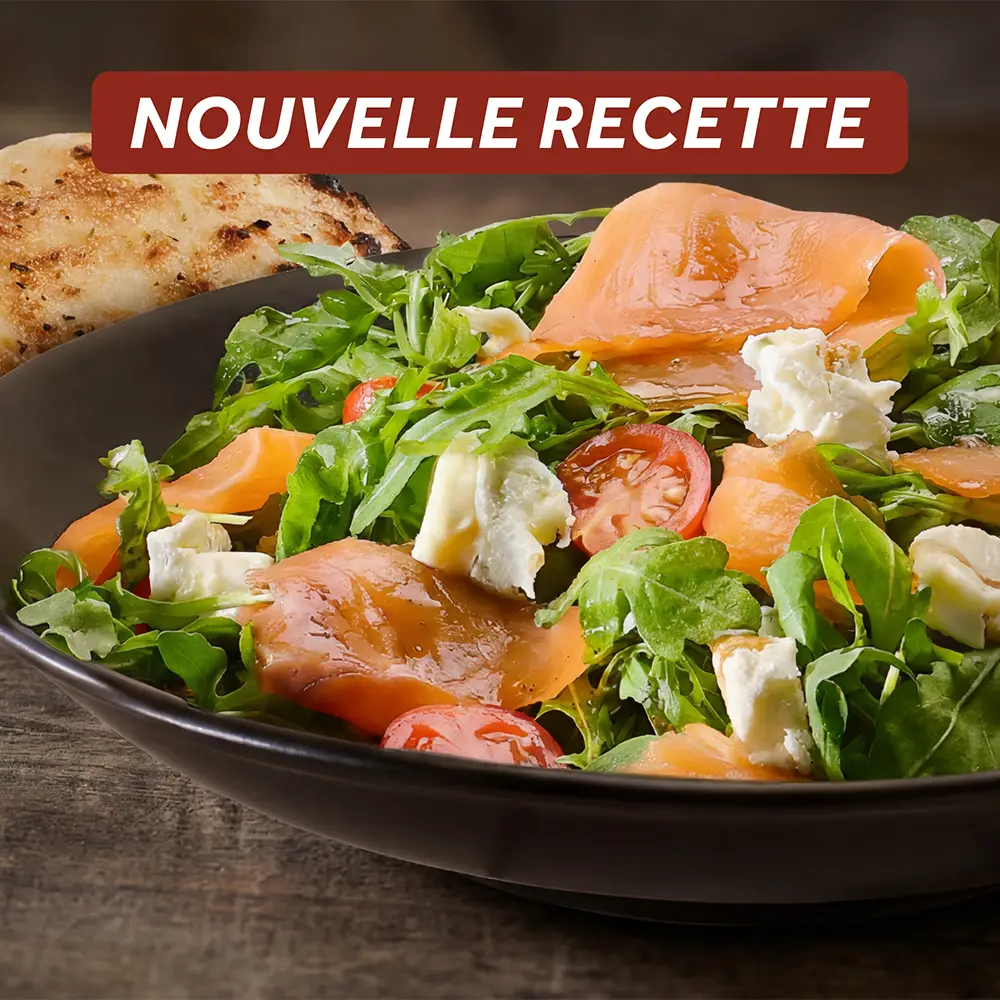 Saumon fumé de Norvège, fromage de chèvre Sainte-Maure de Touraine AOP, tomates cerises, vinaigrette olive balsamique.