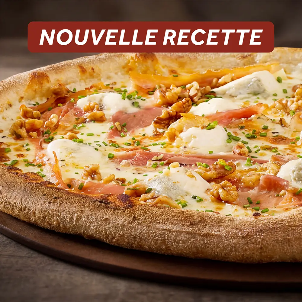 Crème, mozzarella fior di latte, fromage de chèvre Sainte-Maure de Touraine AOP, jambon sec d’Ardèche IGP, persil frais et brisures de noix du Dauphiné.